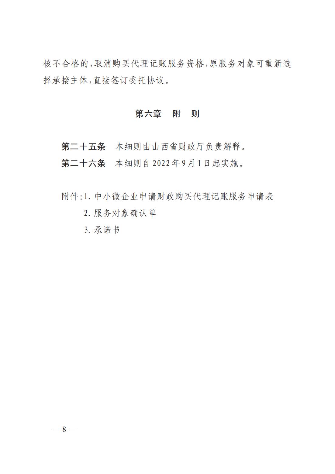 為進(jìn)一步支持全省中小微企業(yè)持續(xù)快速健康發(fā)展,切實(shí)加強(qiáng)和改進(jìn)會(huì)計(jì)服務(wù)能力,根據(jù)《山西省人民政府辦公廳關(guān)于印發(fā)強(qiáng)化市場主體倍增要素服務(wù)保障若干措施(試行)的通知》(晉政辦發(fā)〔2022〕7 號)、《山西省財(cái)政廳關(guān)于加快推進(jìn)云會(huì)計(jì)大數(shù)據(jù)服務(wù)平臺建設(shè)的實(shí)施意見》(晉財(cái)辦〔2022〕19 號)文件要求,省財(cái)政廳研究制定了《山西省財(cái)政廳為中小微企業(yè)購買代理記賬服務(wù)實(shí)施細(xì)則(試行)》,現(xiàn)予以印發(fā),請結(jié)合工作實(shí)際,認(rèn)真抓好貫徹落實(shí)。